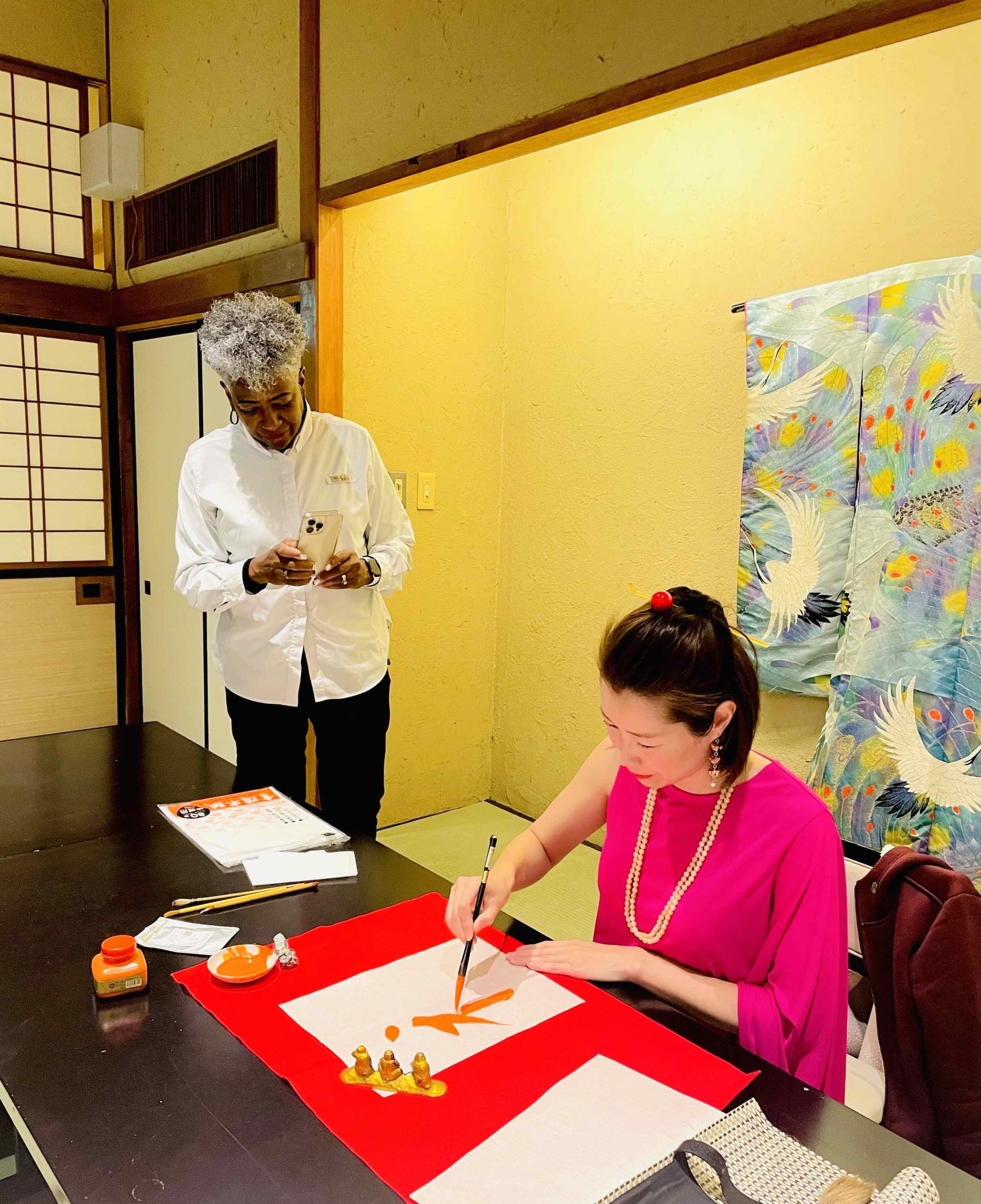 その1時間は、心をリフレッシュし、思い思いのメッセージを美しい文字として書き表す特別な時間でした。筆を握り、墨と紙と向き合いながら、お客様たちは笑顔で楽しい会話を交わし、互いに作品を称賛し合いました。その中でも抹茶書道体験が終わった後、